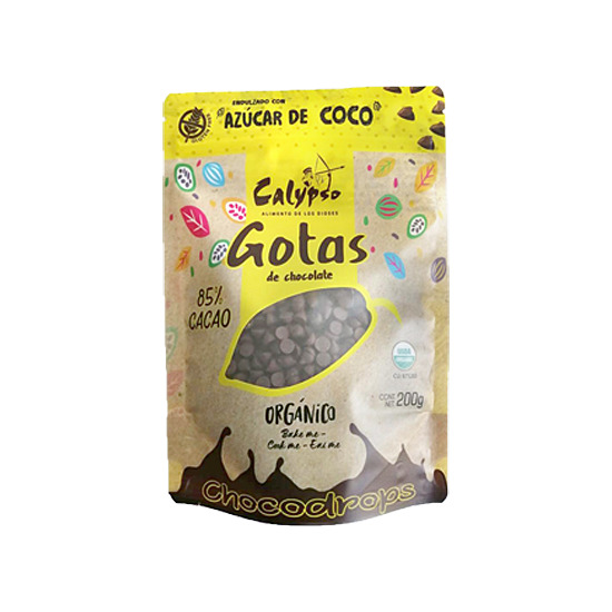 Gotas de chocolate orgánico al 85% de cacao con azúcar de coco 200gr, Calypso